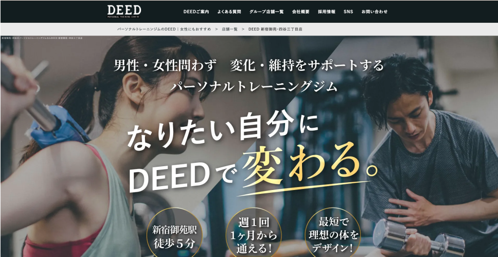 | ジム名 | BEYOND 四谷三丁目新宿御苑店 | かたぎり塾 四谷三丁目店 | パーソナルジム NOOS GYM 四谷三丁目店 | DEEDパーソナルトレーニングジム ∞ 新宿御苑・四谷三丁目店 |
